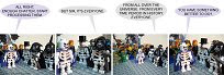 This helps explain the themes that were and were not part of this crossover… as Supers is hand-drawn, even if it had crossed over with anything it’d be impossible for it to mesh with all the LEGO figures in this sequence. But Espionage has been seen to use the IFPoD as well, even if it’s interacted with no other themes and even if getting roped into this crossover would delay the main plot too much.