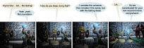 But I like the idea that the last four months of the Fantasy theme, the entire destruction of the universe, stay in the afterlife, and brief flashback to a tavern, has all been part of an extended flashback sequence and we’re only now picking up the plot thread from this strip.