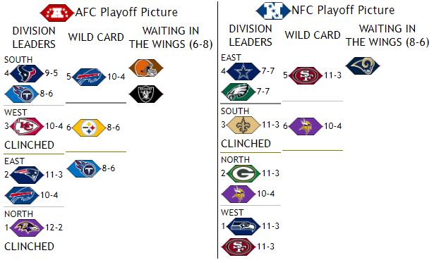 – Huge shakeup in the AFC. Pats loss + Chiefs win now means the Chiefs are the #2 seed with a first round bye, and the Patriots are the #3 seed (vs. Titans/Steelers/Raiders). This means the Patriots will play on WC weekend for the first time since Jan. 2010