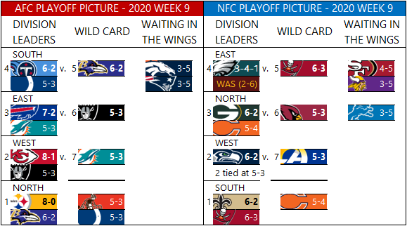 #3 – Titans(6-2) @ Colts(5-3) <—huge AFC South matchup, but other than the Saints and now Buccaneers, NBC hates the other 6 South division teams