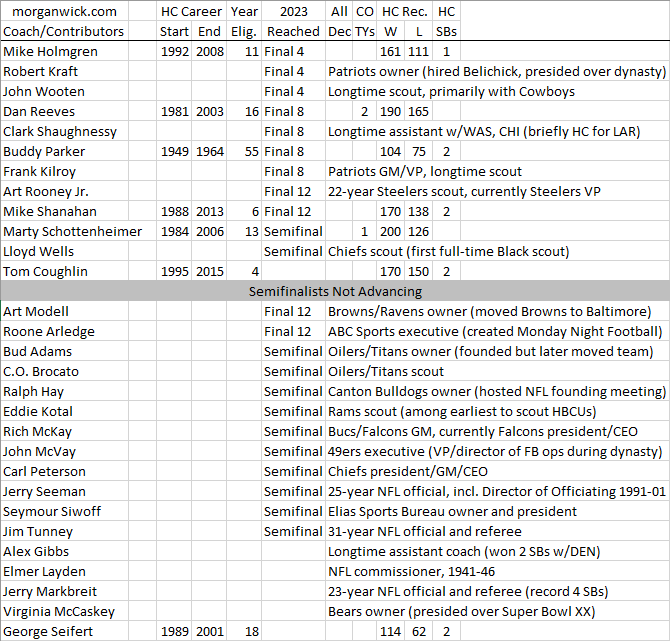 The Coach/Contributor committee is more consistent in who they name from year to year; note that the only two contributors who made the final 12 last year, but didn’t this year, didn’t make it any further last year. Tom Coughlin going from outside the list of 25 last year to being in the final 12 this year, despite not being in his first year of eligibility, is a bit eyebrow-raising, but it’s still a better mark than the senior candidates see. On the other hand, a full five candidates who made the final 25 last year aren’t on the list this year, compared to just one such senior candidate (though the senior candidate list grew more, as the coach/contributor list extended significantly beyond 25 due to ties last year as well; eight senior candidates who weren’t semifinalists or modern-era candidates last year made the final 25 this year, compared to six coaches/contributors). Still, I can say with a little more confidence that Mike Holmgren and Robert Kraft are probably the favorites to advance to the full panel this year (the average fan is far more likely to have heard of either of them than John Wooten, and I’d like to imagine that would give them the edge)…