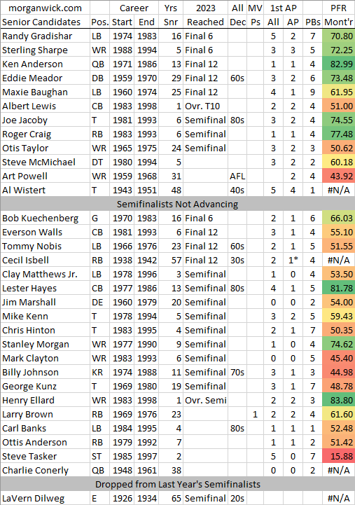 In the chart above, note that Bob Kuechenberg reached the last stage of deliberation before forwarding candidates to the full panel last year, but didn’t make the final 12 this year; conversely, three players who weren’t even among the 25 semifinalists last year made the final 12 this year. Note, too, the significant number of All-Senior Candidate team members that didn’t even make the final 25 last year, none of whom made it this year either; obviously the committee has no obligation and no reason to accept PFR’s Monitor as the end-all and be-all (and the worst such omissions played primarily in the 60s if not actually in the AFL, likely the trickiest period to assess, especially when it comes to postseason honors), but it still illustrates how there’s a lot more room for variation and unpredictability here. You’d think Randy Gradishar and Sterling Sharpe would be favored for advancement given their making the last cut last year, but there’s no guarantee they even make it that far this year, as Kuechenberg can attest. (Similarly, Ken Anderson being a member of the All-Snub Team means less than nothing in terms of how likely he is to make it to the final six, let alone the full panel, despite being in the final 12 last year.)