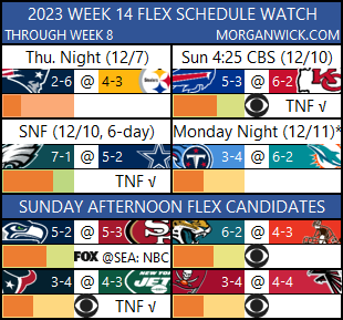 Week 14’s TNF needs to be decided by 11/09/23 and NE-PIT is currently in trouble with some decent options….though it’s 2 recognizable teams and only 2 TNF games can be flexed…..probably stays put