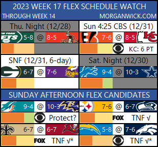 You all bring up good points – I do now believe that no flexes will occur week 17, but what a shame to have a game like that not be shown to most of the country, but Packers-Vikings will be a good one with major playoff implications, as well as Bengals-Chiefs as the Bengals probably won’t be eliminated by gametime.