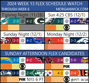 Week 13: I thought Browns-Broncos was a questionable choice to schedule for Monday night in the main flex period, but I doubt very many people predicted that it would be the Browns, not the Broncos, dragging it down. But many of the best teams are off the table due to Thanksgiving, and some of the teams I expected to produce viable Fox games have underperformed as well, leaving the best option on the table a Chargers-Falcons game the league would likely be very reticent to flex in and give the Chargers consecutive Monday night games. Any other options involve teams, at best, only a game better than the Browns. But the Browns might be giving up on the season, so desperate times may end up calling for desperate measures.