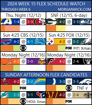 Week 15: Keep an eye on how the Colts and Broncos do over the next month or so, because the Rams’ slow start is opening up the possibility of our first Thursday night flex, and while there’s only one TNF-eligible game on the whole week’s slate, it could well be the best unprotected option overall. Remember that TNF flexing was (officially) instituted as a two-year pilot program, so the league may be especially motivated to get a test of it out of the way. If the Rams continue to falter while the Colts manage to maintain at least a basic level of competence, they may get their chance. (This also assumes CBS can’t protect Colts-Broncos without relinquishing their ability to protect Bills-Lions, so if either of those teams turns out to be more mediocre than thought or the Raiders maintain their own mediocrity, reducing the risk of losing the game to primetime, that may take the Thursday night flex off the table again. But it’s also worth noting that there’s some doubt over the one-road-short-week-game rule, which would open up the possibility of both Bucs-Chargers and Sinners-Saints being TNF-eligible as well.)