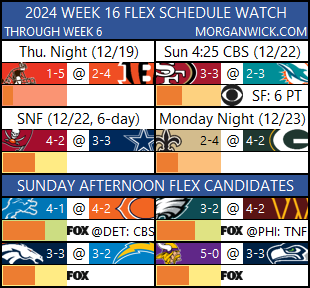 Jags-Eagles might just stay if Indianapolis loses to Miami this Sunday, along with Jacksonville and Philly winning. This is because CBS likely protects Ravens-Broncos if this happens, being their best game of the week, and I don’t think 3-4 is better enough to warrant a flex.