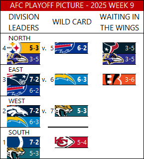 Week 18: If Week 18 were this week Chargers-Broncos, Lions-Bears, and Seahawks-Niners would all determine the order of finish between the teams while deciding division titles or wild card spots; Packers-Vikings and Cardinals-Rams could also qualify for Monday or even Sunday night depending on the tiebreaker situation. Ravens-Steelers and Panthers-Bucs could end up entering the running for standalone windows if those division races tighten. Trumps-Eagles could be a long-shot contender for a Saturday spot if it has seeding implications for the Eagles compared to the other division winners, while Chiefs-Raiders could determine the viability of the Chiefs’ division title or even playoff hopes. The AFC East and South are likely to have their games scheduled simultaneously to decide their respective division titles, though seeding implications could scramble that; if the Broncos, Chargers, and Colts all enter Week 18 with identical records and in their respective division leads, Colts-Texans could be an enticing Saturday candidate. (When it comes to Saturday, I don’t think the league would worry about whether the Jaguars have anything to play for as long as they aren’t playing another playoff contender.)